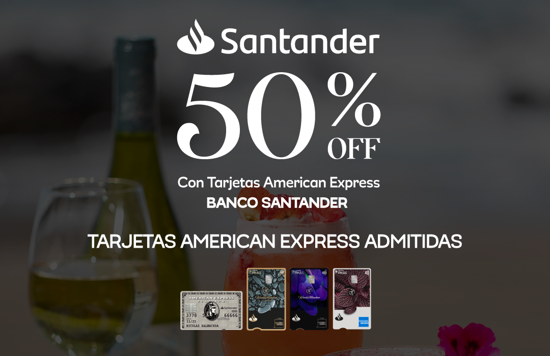 Todos los martes disfruta de un 50% off en toda la carta con tarjetas American Express Banco Santander. Sólo tarjetas admitidas. Tope de descuento diario $50.000 por cuenta, por mesa y por grupo.