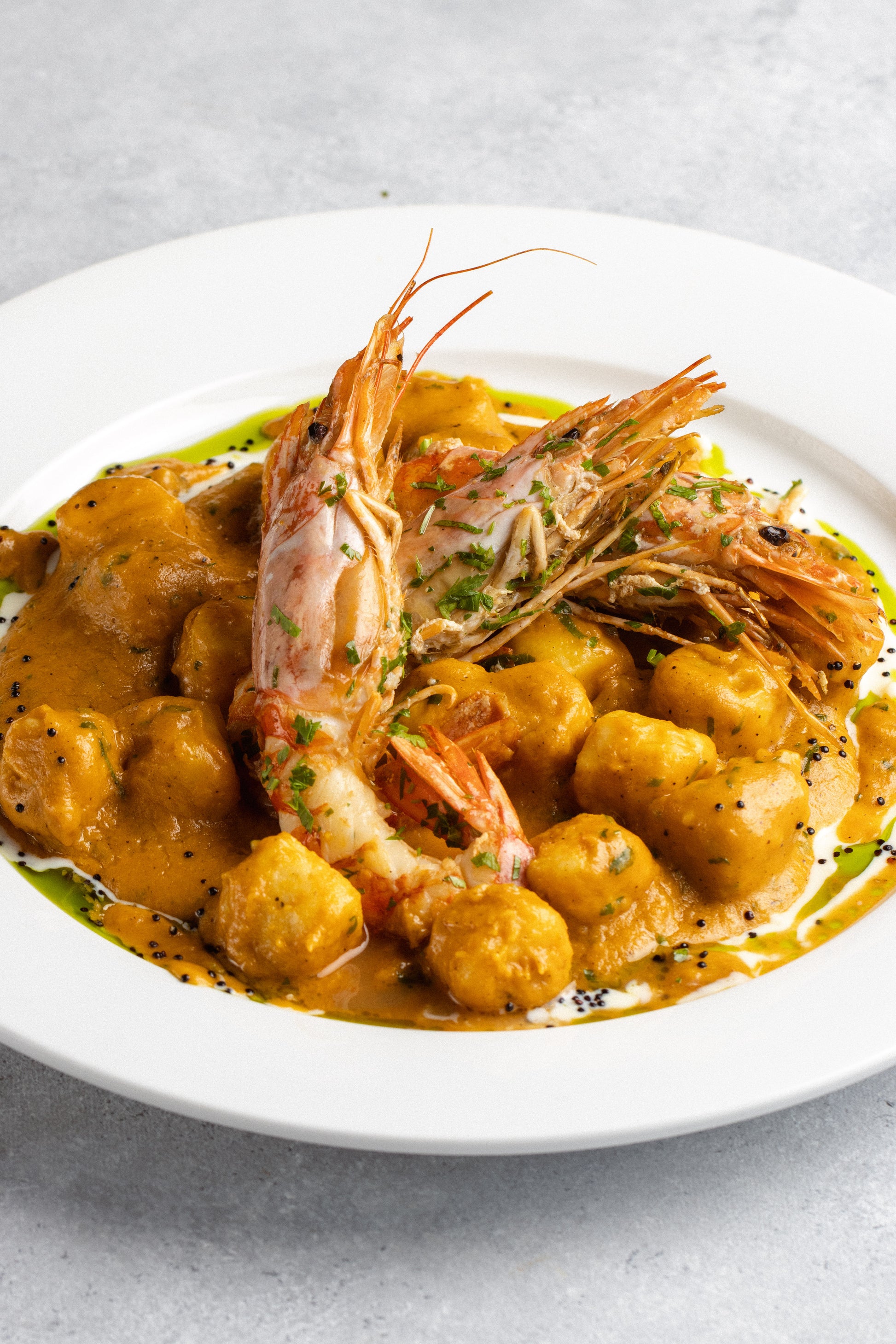 Delicados ñoquis de la casa, salseados en intensos ragú de vegetales asados en crema de crustáceos acompañados de langostinos grillados